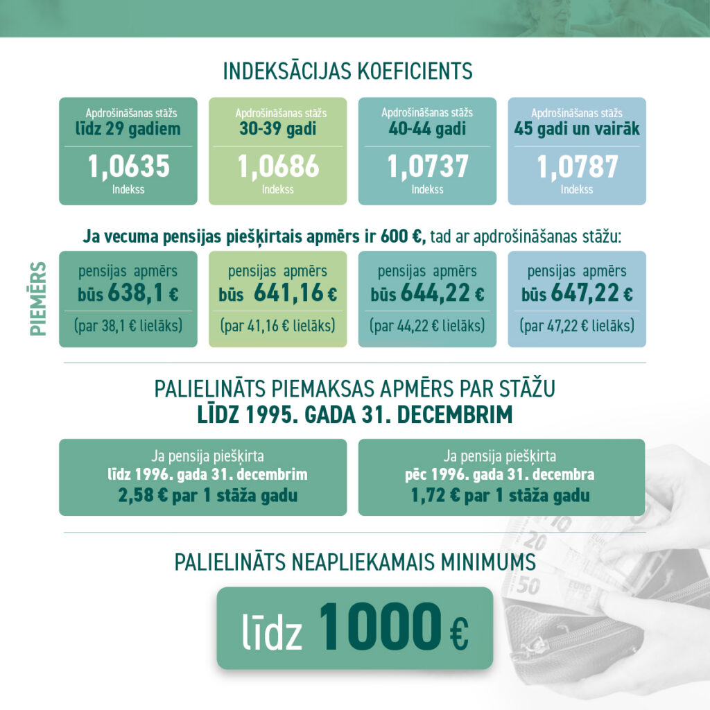 Tas nozīmē, ka esošais piemaksas apmērs, kas šobrīd ir 1,62 eiro un 2,43 eiro par vienu apdrošināšanas stāža gadu, tiks pārskatīts, piemērojot indeksu 1,0635. Līdz ar to cilvēki, kas saņēma 1,62 eiro par katru stāža gadu, kas uzkrāts līdz 1995. gada beigām, turpmāk saņems 1,72 eiro, bet tie, kas saņēma 2,43 eiro – turpmāk saņems 2,58 eiro.