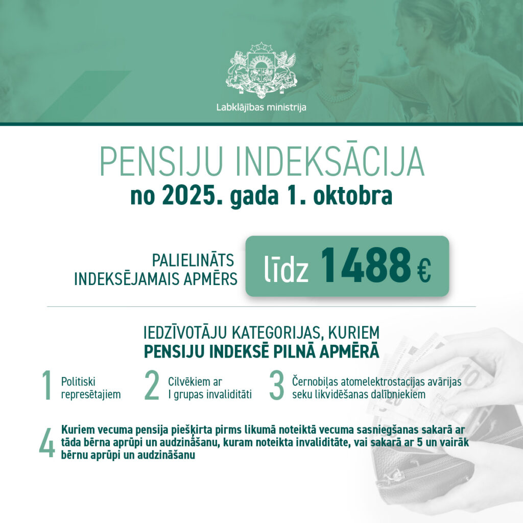 2025. gadā tiks pārskatītas pensijas un atlīdzības vai tās daļas apmērs, kas nepārsniedz 1488 eiro, t. i., iepriekšējā kalendārā gada vidējās apdrošināšanas iemaksu algas valstī apmērā.