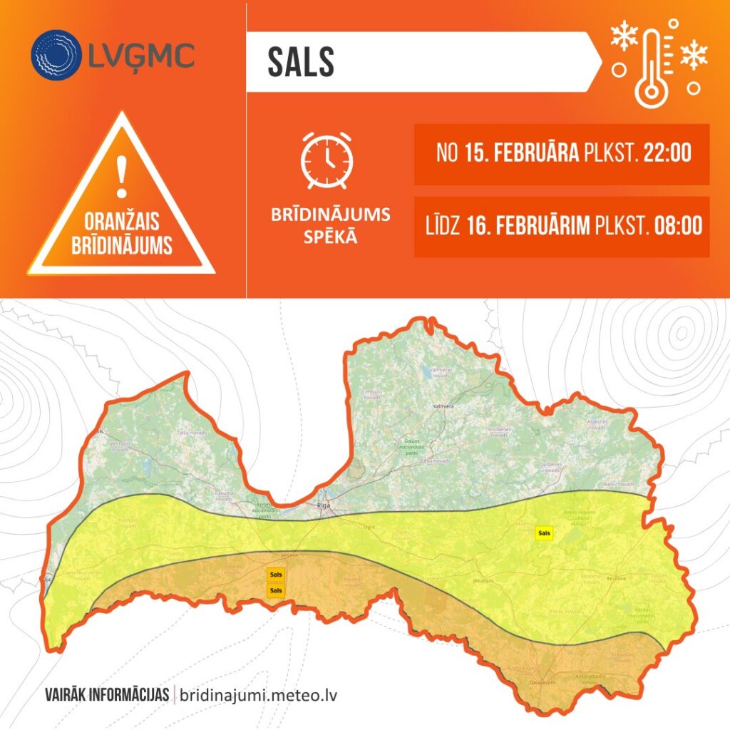 Naktī no 15. uz 16. februārī Latvijas dienvidu daļā gaidāms stiprs sals – gaisa temperatūra pazemināsies līdz -20…-24º, debesīm skaidrojoties, vietām gaidāms ļoti stiprs sals – gaisa temperatūra pazemināsies līdz -25…-27º, liecina LVĢMC dati.