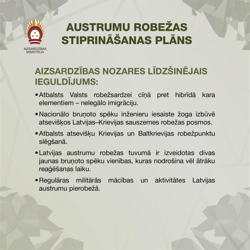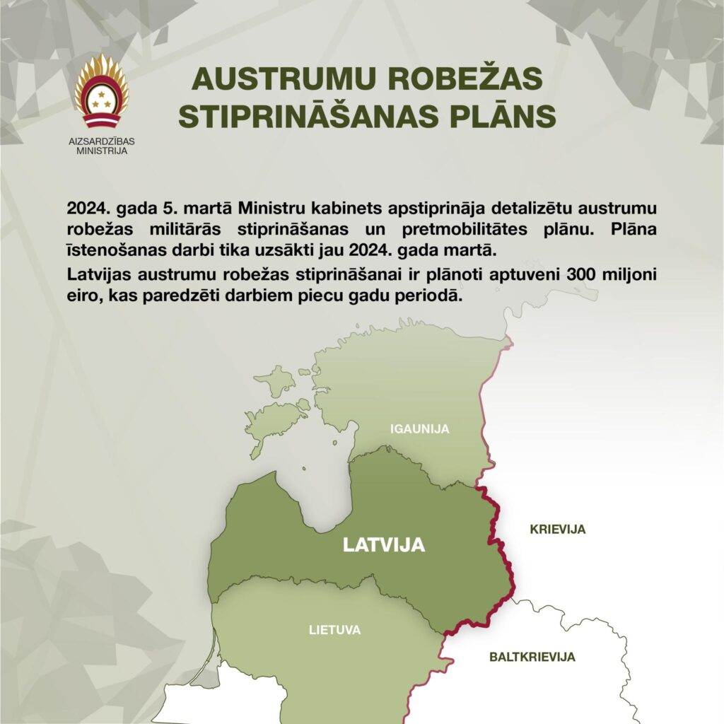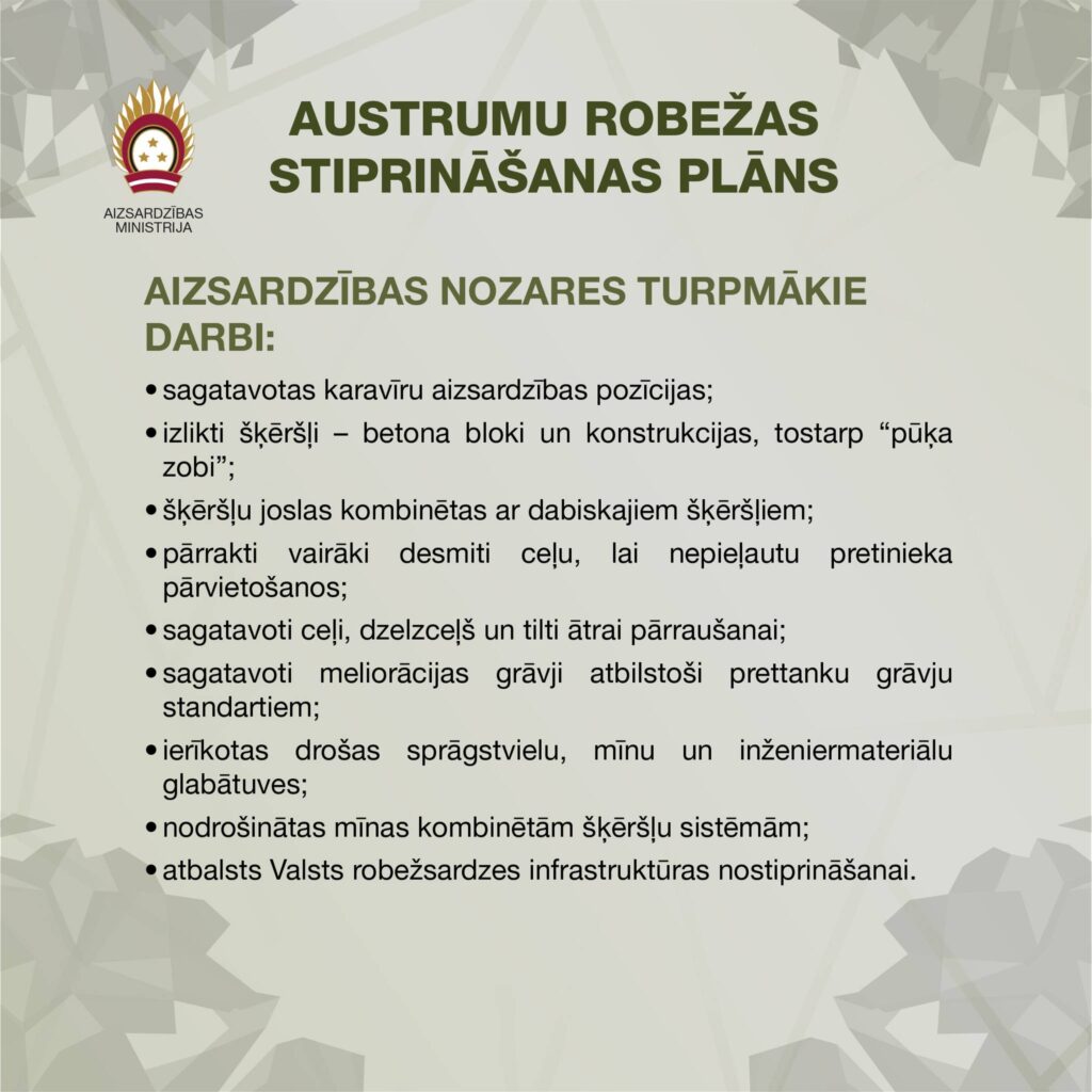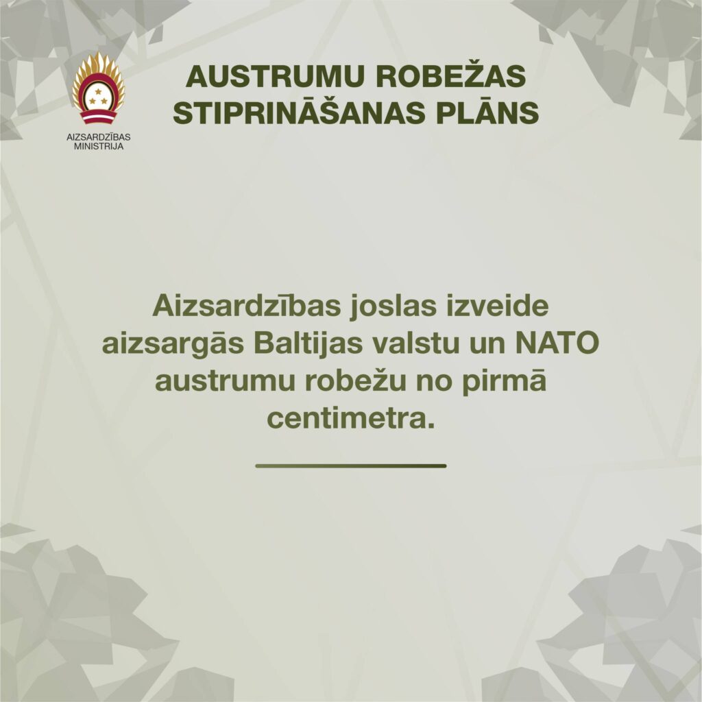 Austrumu robežas militārās stiprināšanas un pretmobilitātes plāns ir daļa no Baltijas aizsardzības līnijas izveides, kas gar visu Krievijas un Baltkrievijas robežu ietvers Nacionālo bruņoto spēku vienību atbalsta punktu izveidi – aizsardzības pozīcijas karavīriem un nocietinātas aizsardzības pozīcijas, dažādus šķēršļus, prettanku grāvjus, munīcijas un mīnu noliktavas. Sensorus.