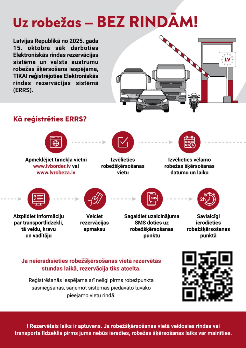 Lai uzlabotu robežšķērsošanas drošību un novērstu autotransporta rindas uz Latvijas austrumu robežas, no 15. oktobra šķērsot Latvijas–Krievijas un Latvijas–Baltkrievijas robežu Grebņevā, Terehovā un Pāterniekos varēs, tikai iepriekš reģistrējoties Elektroniskās rindas rezervācijas sistēmā (ERRS).