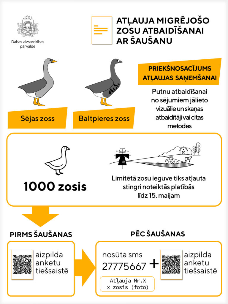 Pieteikuma forma atļauju saņemšanai pieejama pārvaldes tīmekļa vietnes www.daba.gov.lv sadaļā Pakalpojumi Kompensācijas. Savukārt sugu atšķirības, kā arī pirms un pēc limitētās zosu ieguves nepieciešamās darbības skaidro pārvaldes radītā infografika.