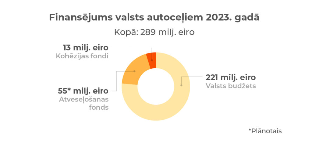 Kopējais finansējums valsts autoceļiem šogad ir 289 miljonu eiro apmērā, no tiem 221 miljoni eiro ir valsts budžets, 13 miljoni eiro – ES Kohēzijas fonda (KF) finansējums, bet 55 miljoni eiro – ES atveseļošanas fonda (AF) finansējums. AF finansējums pieejams šogad un turpmākos trīs gadus un tā uzdevums ir gan mīkstināt Covid pandēmijas negatīvās sekas, gan veicināt drošu satiksmi uz jaunajiem administratīvajiem centriem. Šis finansējums tiek novirzīts būvdarbiem reģionālo un vietējo autoceļu tīklā.