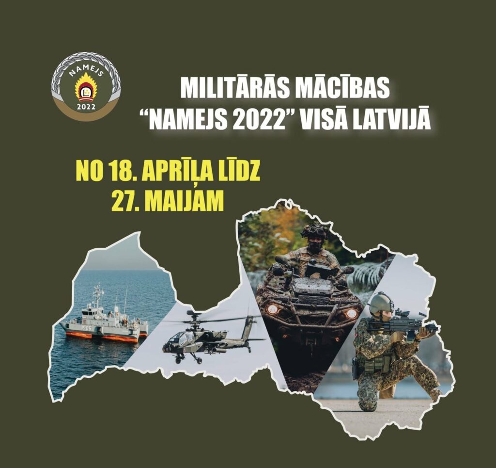Mācību cikla “NAMEJS 2022” pavasara posma lauka taktiskā vingrinājuma laikā no 20. līdz 22. maijam Vidzemē pa valsts galvenajiem un reģionālajiem ceļiem pārvietosies, kā arī apvidū izvērsīsies taktisko uzdevumu veikšanai Latvijas un sabiedroto valstu karavīri un militārā tehnika. Mācību uzdevumi tiks veikti, izmantojot tikai salūtmunīciju un kaujas imitācijas līdzekļus, kas rada troksni, bet neapdraud cilvēku veselību un dzīvību.