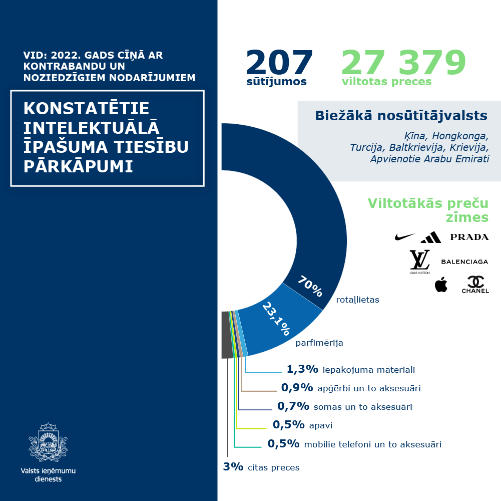 Valsts ieņēmumu dienesta (VID) Muitas pārvaldes amatpersonas, veicot kravu un sūtījumu kontroli, 2022.gadā kopumā 207 gadījumos atklāja 27 379 vienības viltotu preču. 70 % no visām viltotajām precēm bija rotaļlietas, 23 % – parfimērijas izstrādājumi, bet pārējās bija apģērbi, apavi, somas, mobilie telefoni un citas preces.