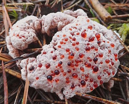 Šīs sēnes sastopamas skuju koku mežos Eiropā, Āzijā, Ziemeļamerikā un pat Ziemeļāfrikā, vietās ar nabadzīgu vai smilšainu augsni. Biežāk – vecos skuju koku mežos, jo tās ir jutīgas pret slāpekļa savienojumu uzkrāšanos augsnē, kas vērojams kailcirtēs. Sēnes ir sastopamas diezgan bieži, bet parasta sēņotāja uzmanību tās piesaista brīdī, kad uz jaunas sēnes augļķermeņa gutācijas rezultātā redzami sarkani pilieniņi. (Gutācija ir ūdens izdalīšanās no augu lapām vai sēnes audiem.) Šajā gadījumā sēne atbrīvojas no liekā ūdens, ko tā uzņēmusi, uzturot nepārtrauktu ūdens plūsmu organismā.