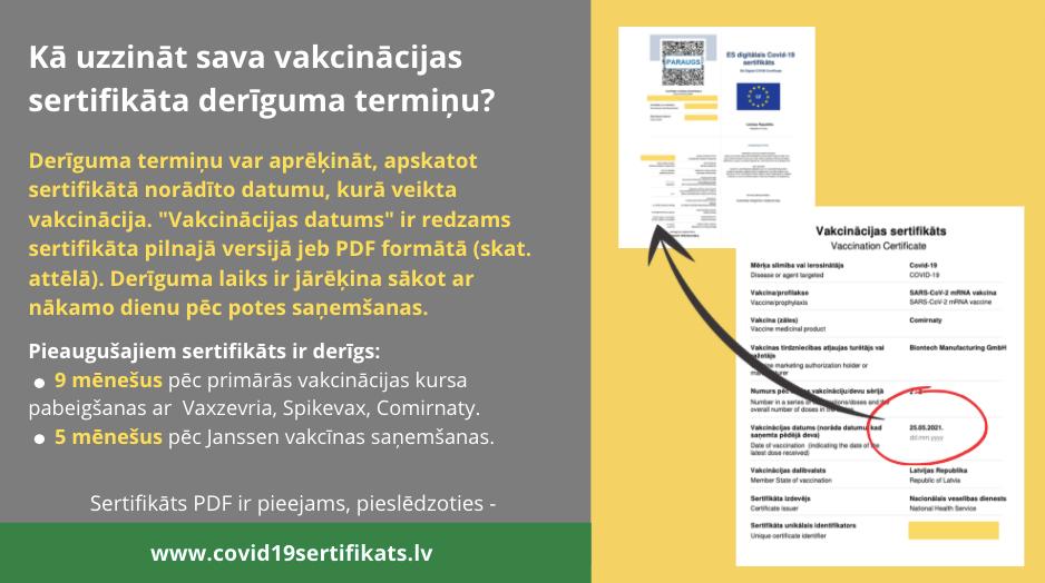 sadaļā “Vakcinācijas datums” (pilnā versija ir pieejama, pieslēdzoties www.covid19sertifikats.lv). Piecu vai deviņu mēnešu derīguma laiks ir jārēķina sākot ar nākamo dienu pēc potes saņemšanas.