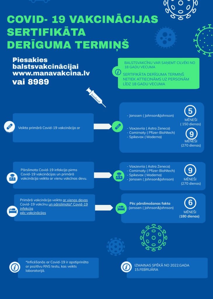 | Vaxzevria (Astra Zeneca) – Comirnaty (Pfizer-BioNtech) -Spikevax (Moderna) ar divām vakcīnu devām – 270 dienas (9 mēneši) Covid-19 Vaccine Janssen (Johnson&Johnson) ar vienu vakcīnas devu – 150 dienas (5 mēneši) | Vaxzevria (Astra Zeneca) Comirnaty (Pfizer-BioNtech) Spikevax (Moderna) Covid-19 Vaccine Janssen (Johnson&Johnson) – 270 dienas (9 mēneši) | Covid-19 Vaccine Janssen (Johnson&Johnson) – 180 dienas pēc pārslimošanas fakta (6 mēneši) |