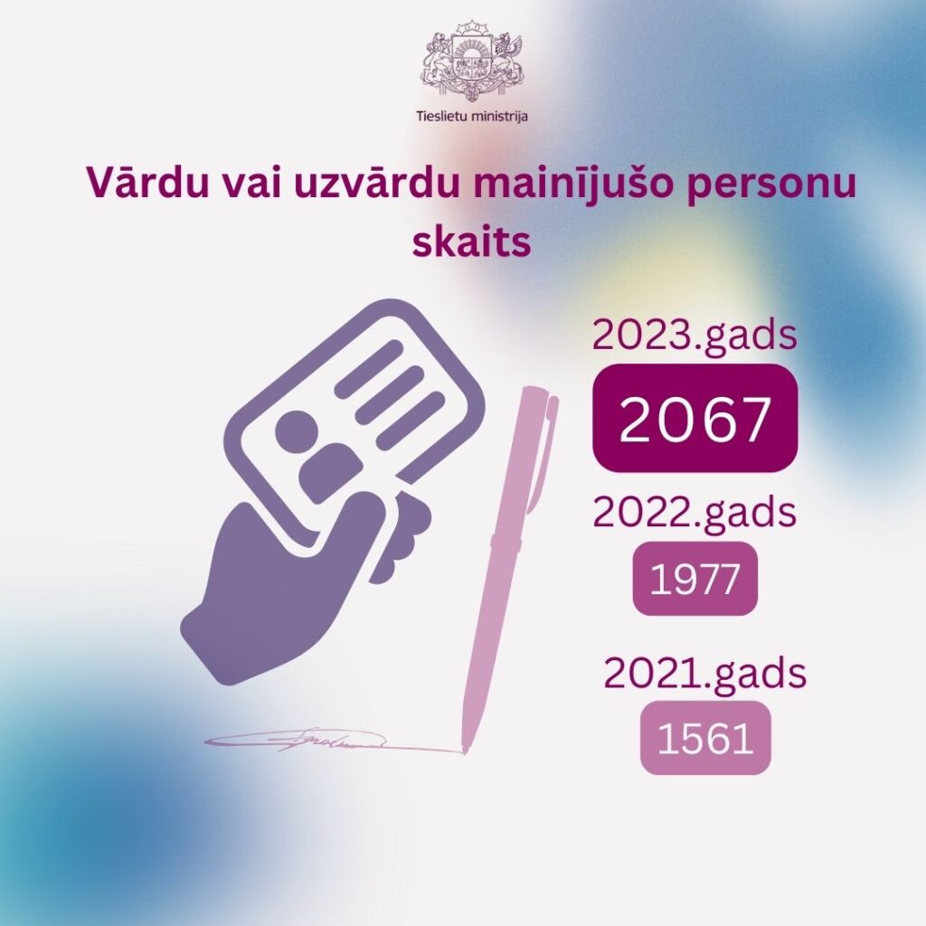 Tieslietu ministrijas Dzimtsarakstu departaments 2023. gadā reģistrējis tautības ierakstu maiņu 94 cilvēkiem, kas ir nedaudz mazāk nekā gadu iepriekš (2022. gadā 125 gadījumi). Savukārt vārdu vai uzvārdu mainījušo skaits 2023. gadā ir nedaudz palielinājies, salīdzinot ar 2022. gadu, Dzimtsarakstu departamentā 2023. gadā pieņemti 2067 lēmumi par vārda vai uzvārda maiņu (2022. gadā 1977 gadījumi).