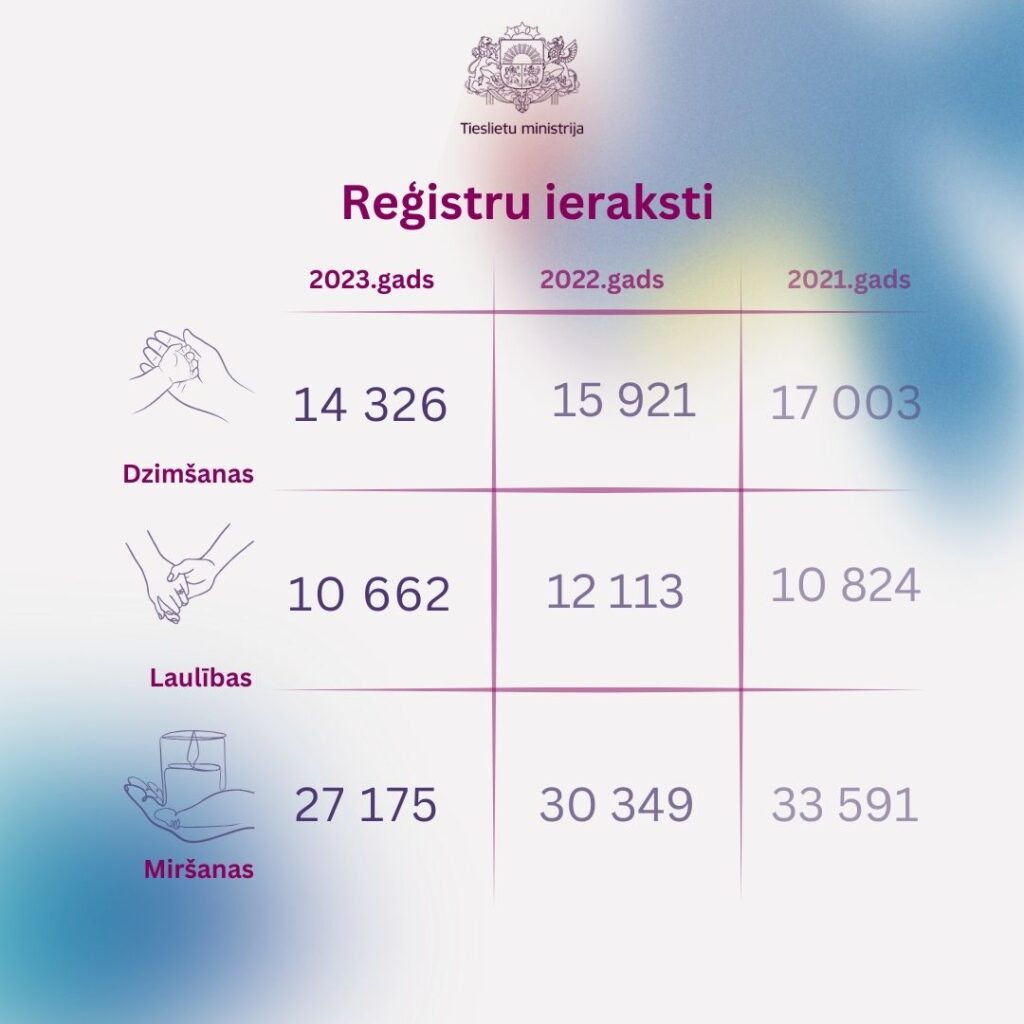 Tieslietu ministrijas apkopotā informācija par aizvadīto gadu liecina, ka samazinājies noslēgto laulību skaits 2023.gadā 10 662 laulības (2022. gadā 12 113 laulības). Tāpat pērn samazinājies mirušo personu skaits – 27 175 (2022. gadā – 30 312), kā arī dzimušo personu skaits – 14 326 (2022. gadā – 15 921).