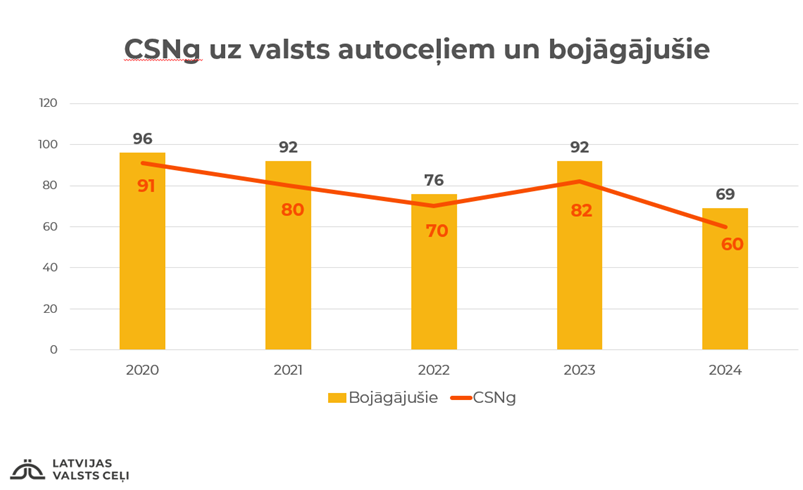 Salīdzinot ar 2023. gadu, pērn ievērojami samazinājies bojāgājušo skaits ceļu satiksmes negadījumos (CSNg) uz valsts autoceļiem: 2023. gadā tie bija 92, pērn – 69 cilvēki. Par to informē VSIA “Latvijas Valsts ceļi”.
