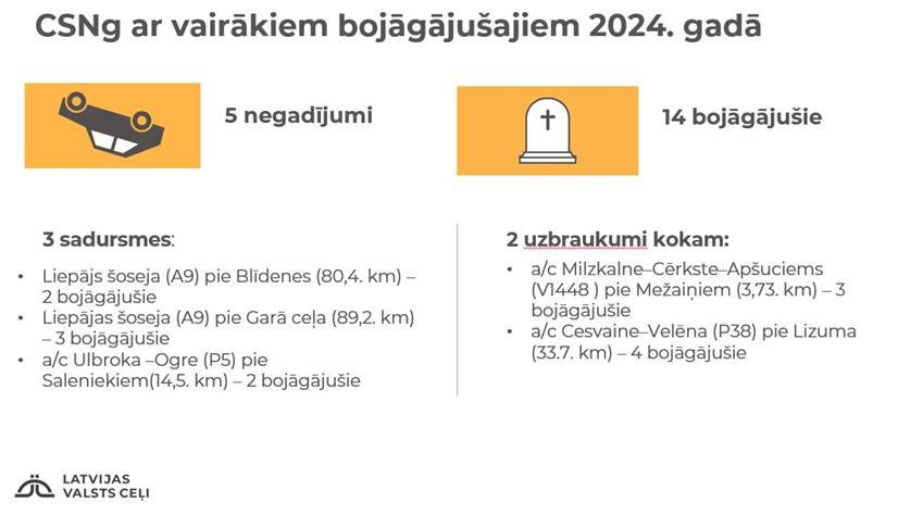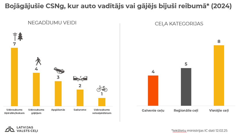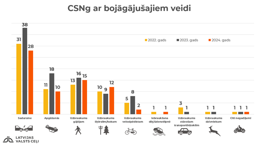 Visvairāk CSNg bojāgājušo pagājušajā gadā, tāpat kā iepriekšējos gados, bija sadursmēs – 28 cilvēki, 2023. gadā tie bija 38. Pērn 15 cilvēku gāja bojā uzbraukumā gājējiem, 2023. gadā – 16; 12 cilvēku gāja bojā uzbraukumos šķērslim, 2023. gadā – deviņi; desmit cilvēki gāja bojā transportlīdzekļu apgāšanās rezultātā, 2023. gadā – 18.