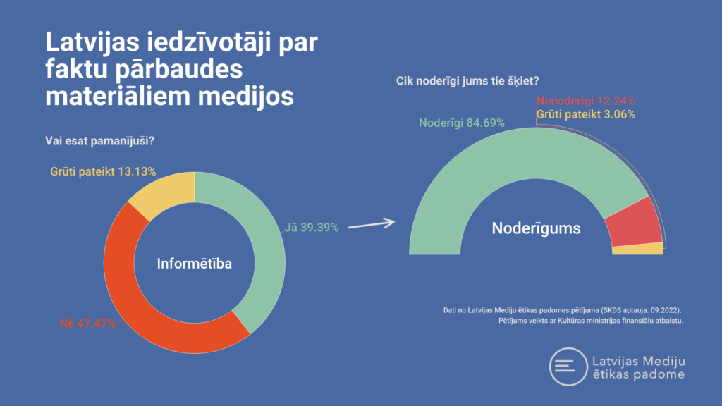39 % Latvijas iedzīvotāju ir pamanījuši medijos faktu pārbaudes materiālus, kur žurnālisti veic dažādu publiskajā telpā pieejamu (piemēram, politiķu vai kādu citu cilvēku izteiktu, vai sociālajās saziņas platformās izplatītu) izteikumu pārbaudi un cenšas noskaidrot, vai attiecīgie apgalvojumi atbilst patiesībai un nav melīgi, maldinoši vai neprecīzi. 84 % no tiem aptaujas dalībniekiem, kuri faktu pārbaudes materiālus ir pamanījuši, tos vērtē kā noderīgus. Šāds secinājums izriet no biedrības Latvijas Mediju ētikas padome (LMĒP) un pētījumu centra SKDS veiktā pētījuma par Latvijas iedzīvotāju attieksmi pret medijiem un to darba vērtējumu (*).