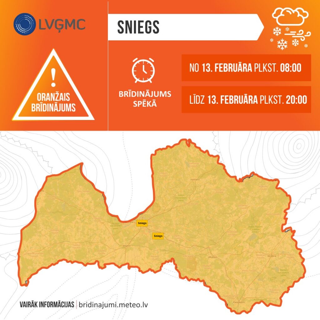 LVĢMC informē, ka piektdien, sākot ar rītu, visā valstī ilgstoši un stipri snigs, sniega sega daudzviet palielināsies par 10-12 cm, tādēļ visā valstī spēkā oranžās pakāpes brīdinājums. Valsts dienvidaustrumos pastāv arī atkalas risks. Ziemeļaustrumu, austrumu vējš turpinās pieņemties spēkā un brāzmās sasniegs 15-18 m/s, Kurzemē līča piekrastē vējš būs vēl mazliet spēcīgāks – līdz 20 m/s. Temperatūra gaidāma -5…-10° robežās, vienīgi Latgalē būs mazliet siltāks, tur -2…-5°.