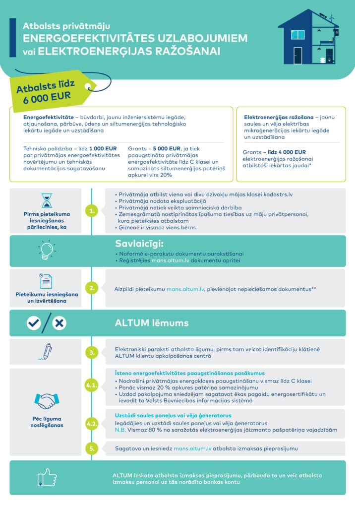 Ekonomikas ministrijas izstrādātās programmas atbalsts privātmāju īpašniekiem visā Latvijā paredzēts grantu, tehniskās palīdzības un garantiju veidā, un maksimālā atbalsta summa būs 6000 eiro. Pieteikumus varēs iesniegt ALTUM klientu apkalpošanas portālā mans.altum.lv.
