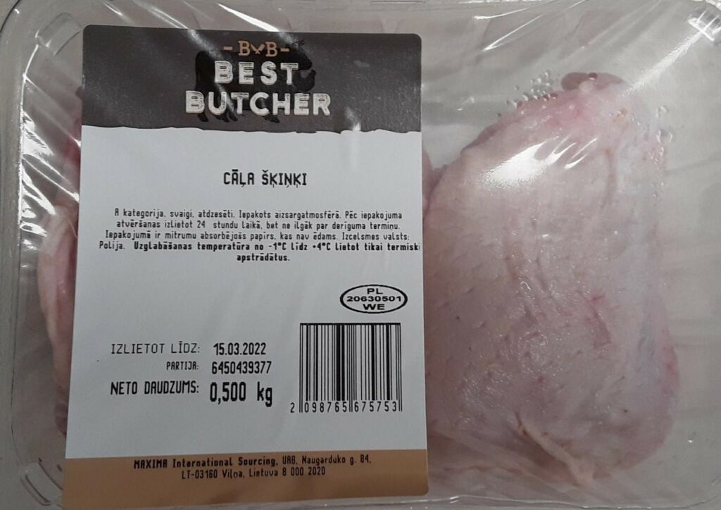 - Cāļa kājas ar muguru “Best Butcher” (PL 20630501 WE), derīguma termiņš – 15.03.2022., partija nr. 6450439369, izplatītājs – Maxima International Sourcing, UAB;