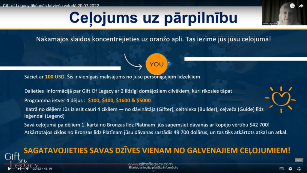 “YouTube” platformā izplatīts aicinājums iesaistīties piramīdveida shēmā “Gift of Legacy”, solot līdz pat 42 700 dolāru lielu peļņu, sākotnēji investējot (dāvinot) 100 dolārus. Videomateriālā izskaidrota shēmas būtība – “dāvinot” 100 dolārus un piesaistot vismaz divus jaunus “dāvinātājus”, jaunais dalībnieks nonāk nākamajā kārtā, savukārt brīdī, kad katrs no piesaistītajiem “dāvinātājiem” atkal būs atradis vismaz divus “dāvinātājus”, dalībnieks nonāk tālāk nākamajā kārtā. Pēc vēl viena šāda cikla atkārtošanās tiek saņemta iespēja kļūt par to personu, kas pati saņem “dāvinājumus”. Kļūstot par saņēmēju un veicot jau lielākas iemaksas nākamajā līmenī, tiek piedāvāts pakāpeniski saņemt “dāvanās” līdz pat 42 700 dolāriem. Tādējādi sākotnēji jaunam dalībniekam kā “dāvinātājam” jāsamaksā 100 dolāri, otrajā līmenī 400, trešajā līmenī 1600 un ceturtajā jau 5 000 dolāru, par to solot pasakainu peļņu 42 700 dolāru apmērā. Vienlaikus videomateriālā nepārtraukti tiek mudināts veidot savu “komandu”, proti, piesaistīt jaunus “dāvinātājus”, kas palīdzēs ātrāk sasniegt mērķi. PTAC brīdina, ka šī ir klasiska piramīdveida shēma un aicina patērētājus šādā un līdzīgās shēmās neiesaistīties.