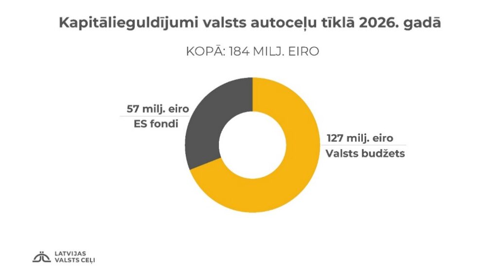 Kopumā valsts ceļu tīklā šogad tiek plānoti kapitālieguldījumi 184 miljoni eiro, no tiem 57 miljoni eiro plānoti kā ES līdzfinansējums.