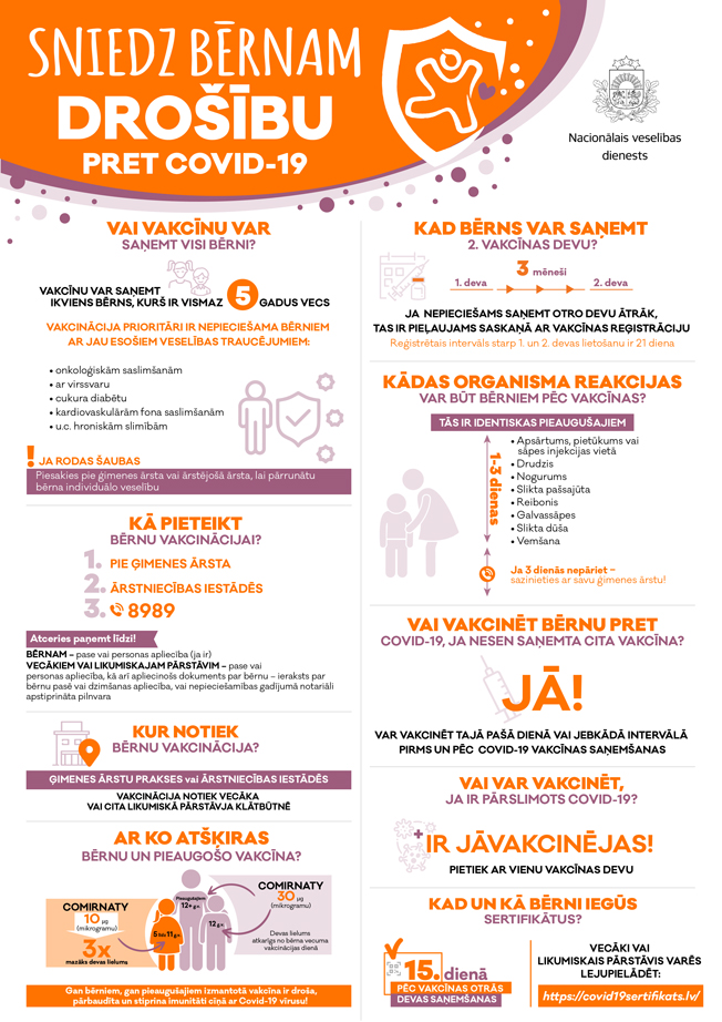 Vakcinācijas sertifikāts bērniem vecumā no 5 līdz 11 gadiem būs izmantojams 15.dienā pēc vakcīnas otrās devas saņemšanas. To bērna vecāki vai likumiskais pārstāvis varēs lejupielādēt vietnē https://covid19sertifikats.lv/.