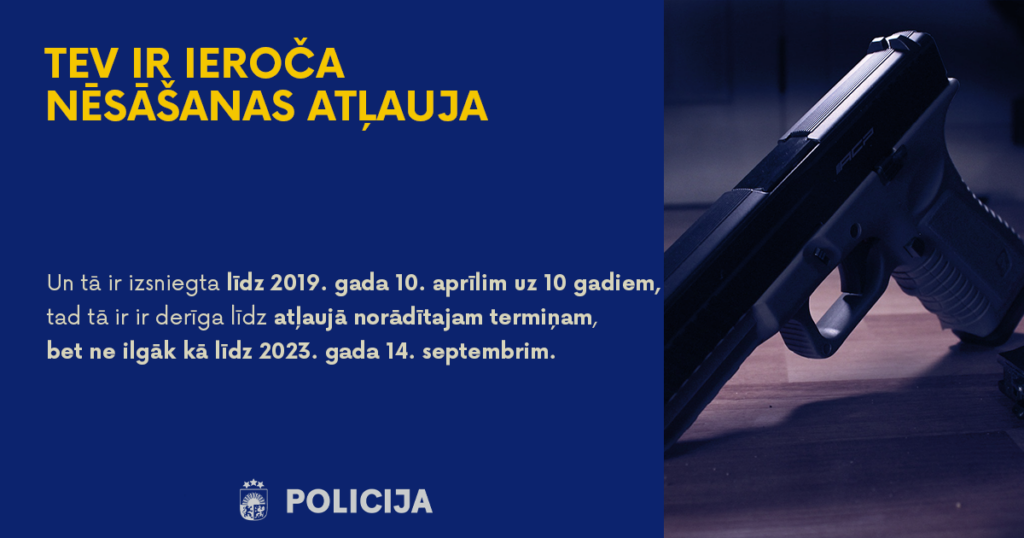 Fiziska persona var iesniegt iesniegumu par ieroča glabāšanas, nēsāšanas vai kolekcijas atļaujas termiņa pagarināšanu jebkurā personai piemērotā laikā līdz šī gada 14. septembrim un tajā Valsts policijas struktūrvienībā, kurā ierocis reģistrēts.
