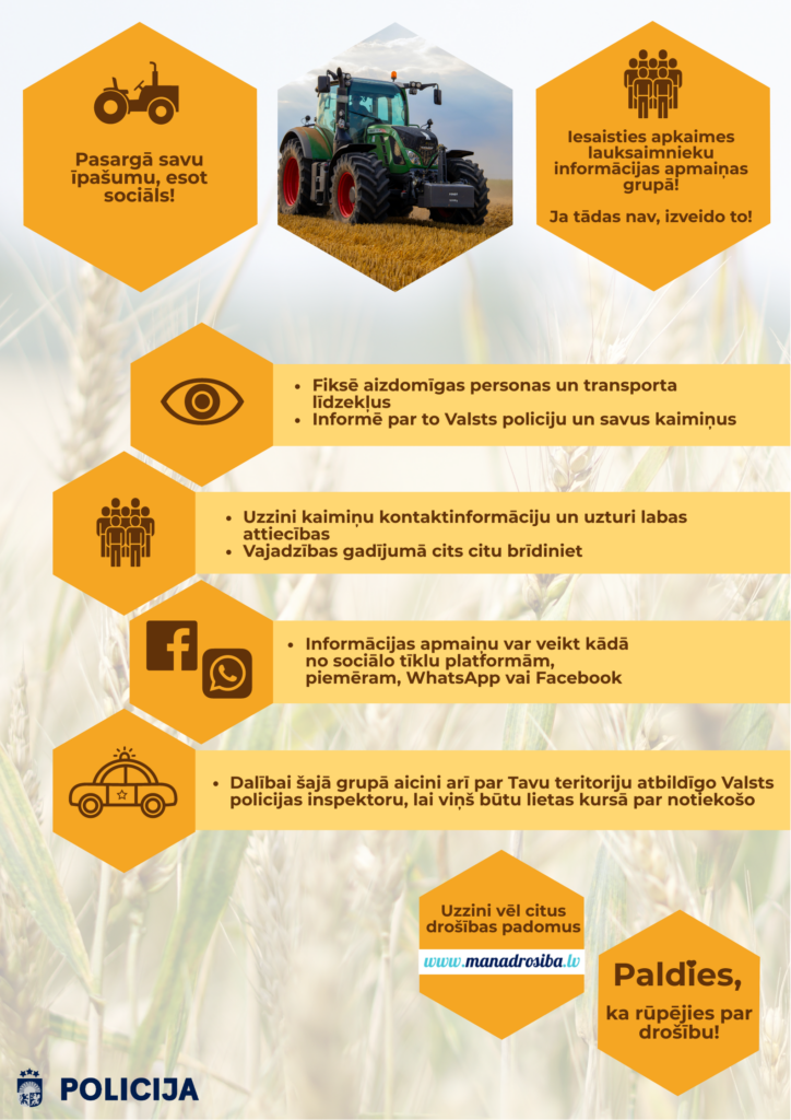 Šajā laika posmā četros gadījumos nozagta pati traktortehnika, tāpat reģistrēti daži gadījumi, kad nozagtas traktortehnikas detaļas. Lai pasargātu savu smago tehniku no zagļiem, Valsts policija saimniekus aicina parūpēties par tās drošību. Tāpat svarīgi arī uzturēt labas attiecības ar apkārtnes iedzīvotājiem, kas atvieglo informācijas apmaiņu. Jāpievērš pastiprināta uzmanība aizdomīgām personām, kurām varētu būt noziedzīgi nolūki, un par tām nekavējoties jāziņo policijai.