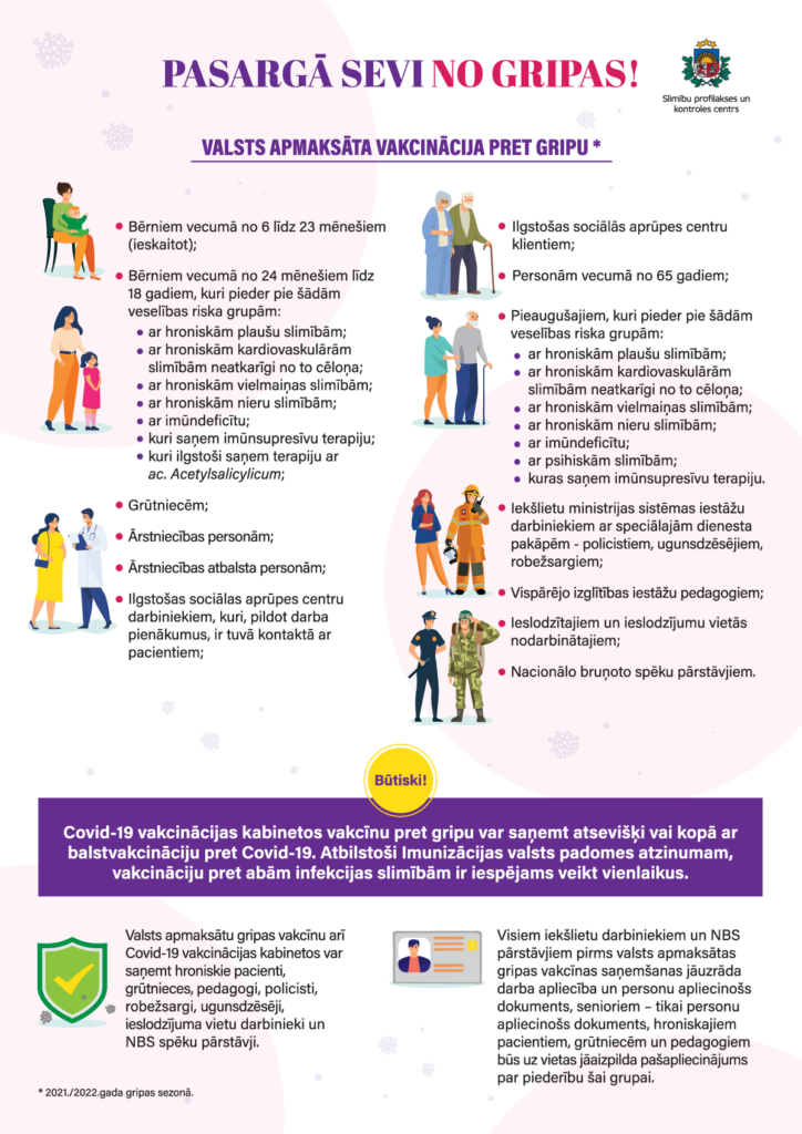 Informācija un ieteikumi iedzīvotājiem par gripas profilakses pasākumiem: https://www.spkc.gov.lv/lv/informacija-un-ieteikumi-iedzivotajiem-par-gripas-profilakses-pasakumiem