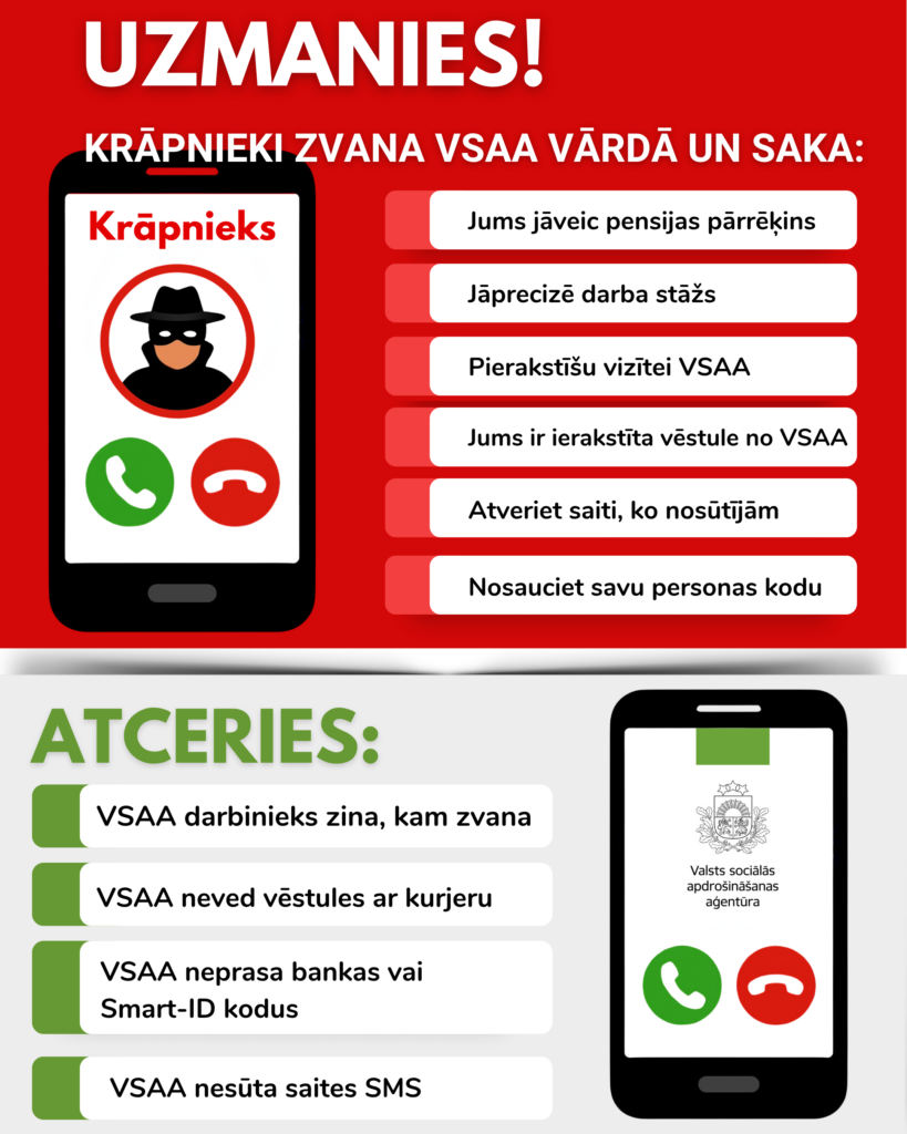 Ja rodas aizdomas par krāpniecisku zvanu, ieteicams nekavējoties pārtraukt sarunu un sazināties ar VSAA, zvanot pa tālruni 64507020 vai uz jebkuru klientu apkalpošanas centru, lai pārliecinātos, vai kāds no VSAA tiešām ir zvanījis. Ja steigā krāpnieciskās saitēs ievadīti bankas dati, jāinformē sava banka un Valsts policija.