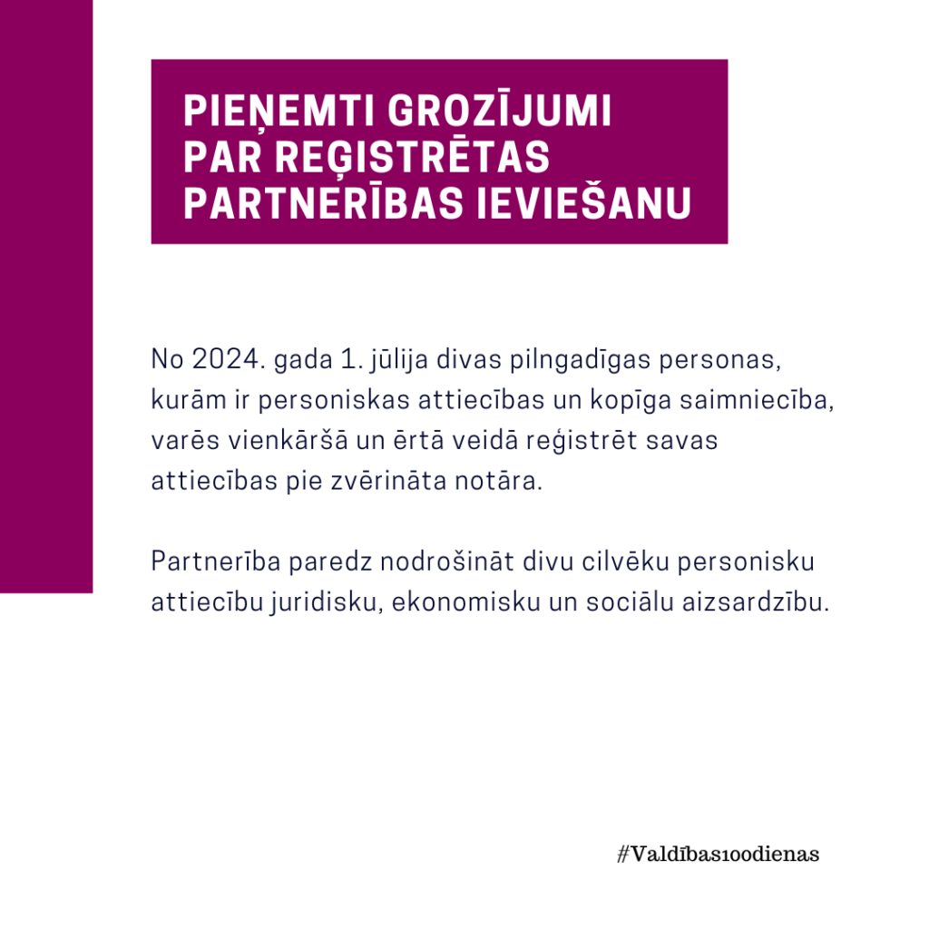 Valdības pirmajās 100 darbības dienās tika virzīti un Saeimā pieņemti grozījumi par reģistrētas partnerības ieviešanu Latvijā, kas valdības deklarācijā tika norādīts kā steidzami izdarāms darbs, izpildot Satversmes tiesas spriedumu. No 2024. gada 1. jūlija divas pilngadīgas personas, kurām ir personiskas attiecības un kopīga saimniecība, varēs vienkāršā un ērtā veidā reģistrēt savas attiecības pie zvērināta notāra. Partnerība paredz nodrošināt divu cilvēku personisku attiecību juridisku, ekonomisku un sociālu aizsardzību.