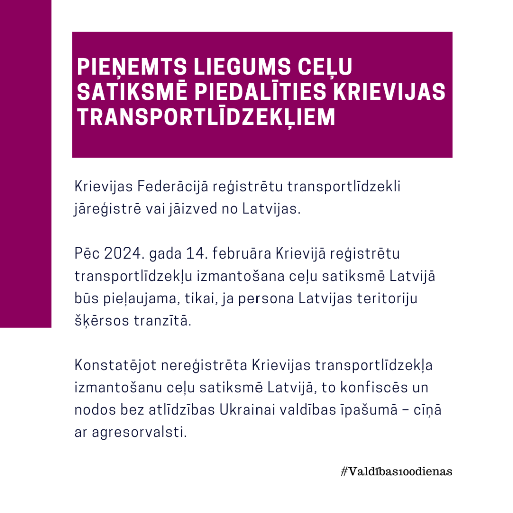 Lai stiprinātu valsts un sabiedrības drošību, pieņemts liegums ceļu satiksmē piedalīties Krievijas Federācijā reģistrētiem transportlīdzekļiem. Transportlīdzekli būs jāreģistrē vai jāizved no Latvijas. Pēc 2024. gada 14. februāra Krievijā reģistrētu transportlīdzekļu izmantošana ceļu satiksmē Latvijā būs pieļaujama, tikai, ja persona Latvijas teritoriju šķērsos tranzītā. Konstatējot nereģistrēta Krievijas transportlīdzekļa izmantošanu ceļu satiksmē Latvijā, to konfiscēs un nodos bez atlīdzības Ukrainai cīņā ar agresorvalsti.