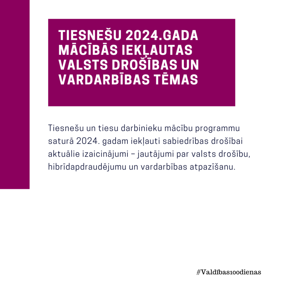 Reaģējot uz aktuālajiem izaicinājumiem hibrīdapdraudējuma apstākļos un vardarbības noziegumu mazināšanā, tiesnešu un tiesu darbinieku mācību programmu saturā 2024. gadam iekļauti sabiedrības drošībai aktuālie jautājumi par valsts drošību un vardarbības atpazīšanu. Tāpat ieguldīts apjomīgs darbs, lai turpinātu attīstīt Valsts vienoto jurista profesionālās kvalifikācijas eksāmenu, tā veicinot Latvijas juristu ataudzi un konkurētspēju starptautiskā līmenī.