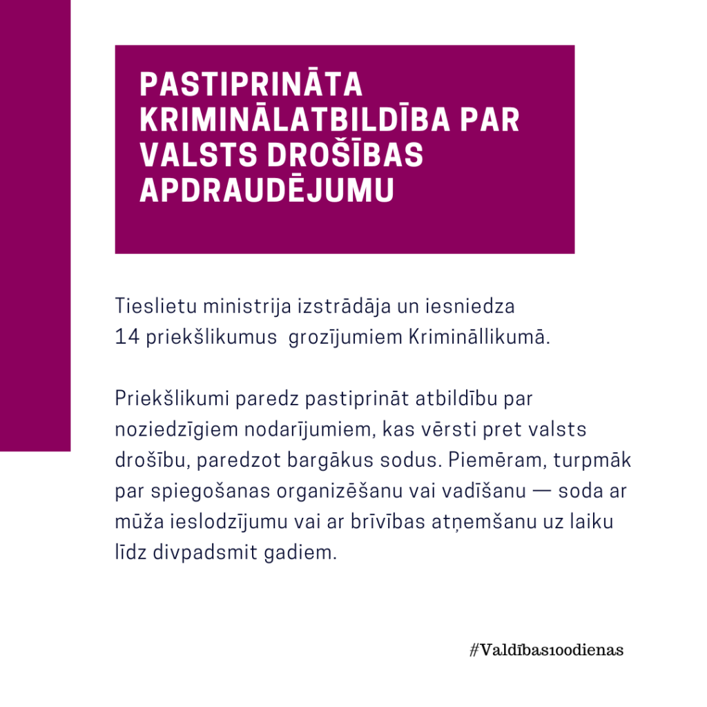 Tieslietu ministrija Ineses Lībiņas-Egneres vadībā uzsākusi arī kriminālsodu reformu, lai kriminālsodi atspoguļotu atbildību par sabiedrībā aizsargājamām vērtībām, īpašu uzmanību pievēršot noziegumiem pret valsti Krievijas agresīvā kara Ukrainā un pret Latviju vērstā hibrīdapdraudējuma laikā. Gada nogalē Saeima pieņēma Tieslietu ministrijas izstrādātos grozījumus Krimināllikumā, kas pastiprina atbildību par noziedzīgiem nodarījumiem, kas vērsti pret valsts drošību, paredzot bargākus sodus un iekļaujot trīs jaunus pantus – “Palīdzība ārvalstij pret citu valsti vērstā darbībā”, “Spiegošanas organizēšana un vadīšana” un “Aizlieguma pārkāpšana organizēt un veikt militāri taktisku uzdevumu izpildes apmācības, un piedalīties tajās”. Piemēram, turpmāk par spiegošanas organizēšanu vai vadīšanu paredzēts mūža ieslodzījums vai brīvības atņemšana uz laiku no 8 līdz 12 gadiem.