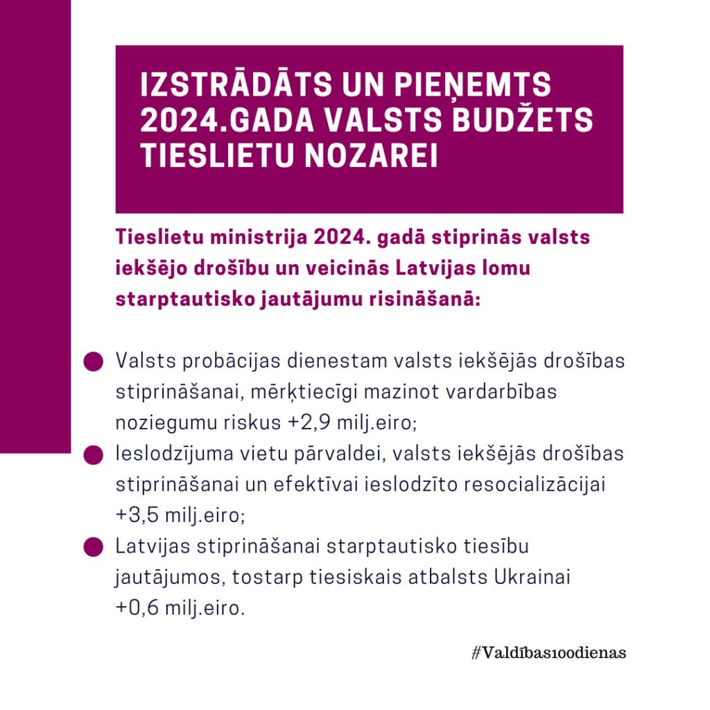 Savukārt 2024. gadā valsts budžeta ietvaros tiks stiprināta valsts iekšējā drošība un veicināta Latvijas loma starptautisko jautājumu risināšanā: Valsts probācijas dienestam, lai mērķtiecīgi mazinātu vardarbības noziegumu riskus, papildus piešķirti 2,9 miljoni eiro, savukārt Ieslodzījuma vietu pārvaldei efektīvai ieslodzīto resocializācijai papildus piešķirti 3,5 miljoni eiro, bet Latvijas stiprināšanai starptautisko tiesību jautājumos, tostarp tiesiskajam atbalstam Ukrainai 0,6 miljoni eiro.