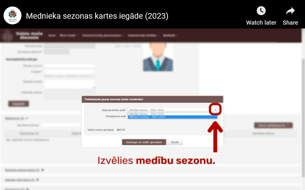 Informācija par mednieka sezonas karti, ieskaitot video instrukciju par tās iegādi tiešsaistē Meža valsts reģistrā, pieejama Valsts meža dienesta mājaslapā.