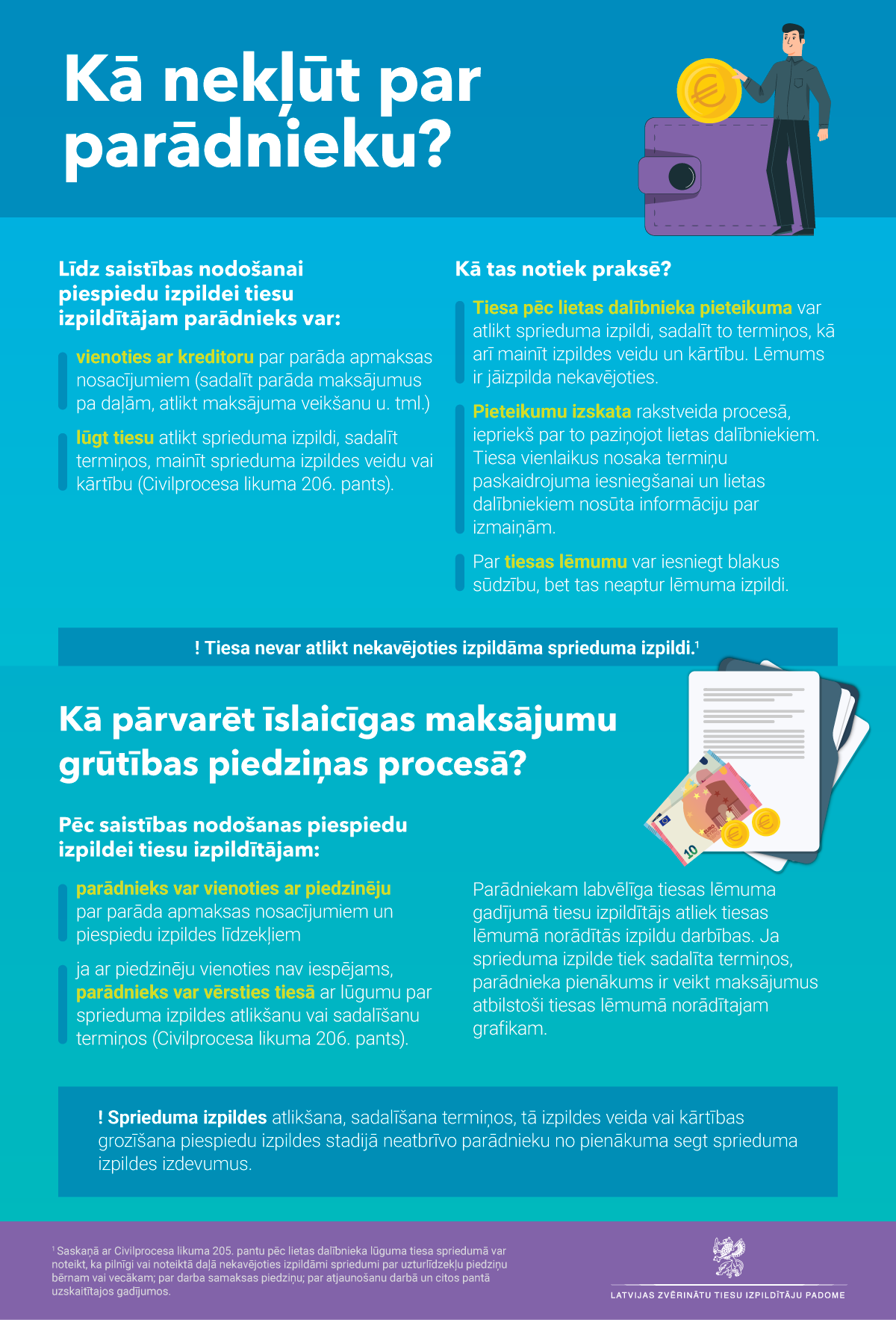 Iedzīvotājiem būs iespējams konsultēties par to, ko darīt, lai lieta nenonāktu līdz piespiedu izpildei, par iespējām sadalīt parāda apmaksu pa daļām vai sprieduma izpildes atlikšanu. Saskaroties ar finansiālām grūtībām, parādnieks var lūgt kreditoru vienoties par maksājumu veikšanu pa daļām vai atlikt maksājumu veikšanu. Tiesvedības stadijā tiesa ir tiesīga pēc lietas dalībnieka pieteikuma, ievērojot pušu mantisko stāvokli, bērnu tiesības vai citus apstākļus, pieņemt lēmumu par sprieduma izpildīšanas atlikšanu vai sadalīšanu termiņos, kā arī par tā izpildes veida un kārtības grozīšanu.