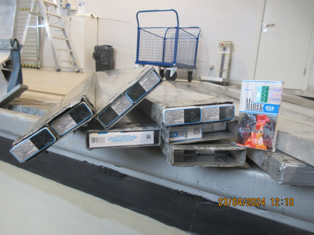Padziļinātās kontroles laikā muitas amatpersonas konstatēja, ka septiņpadsmit kravas nodalījuma sānu bortu alumīnija starplikas ir piepildītas ar cigaretēm. Kontroles rezultātā tika izņemtas 21 420 cigaretes “Minsk” jeb 1071 paciņa cigarešu ar Baltkrievijas Republikas akcīzes nodokļa markām.