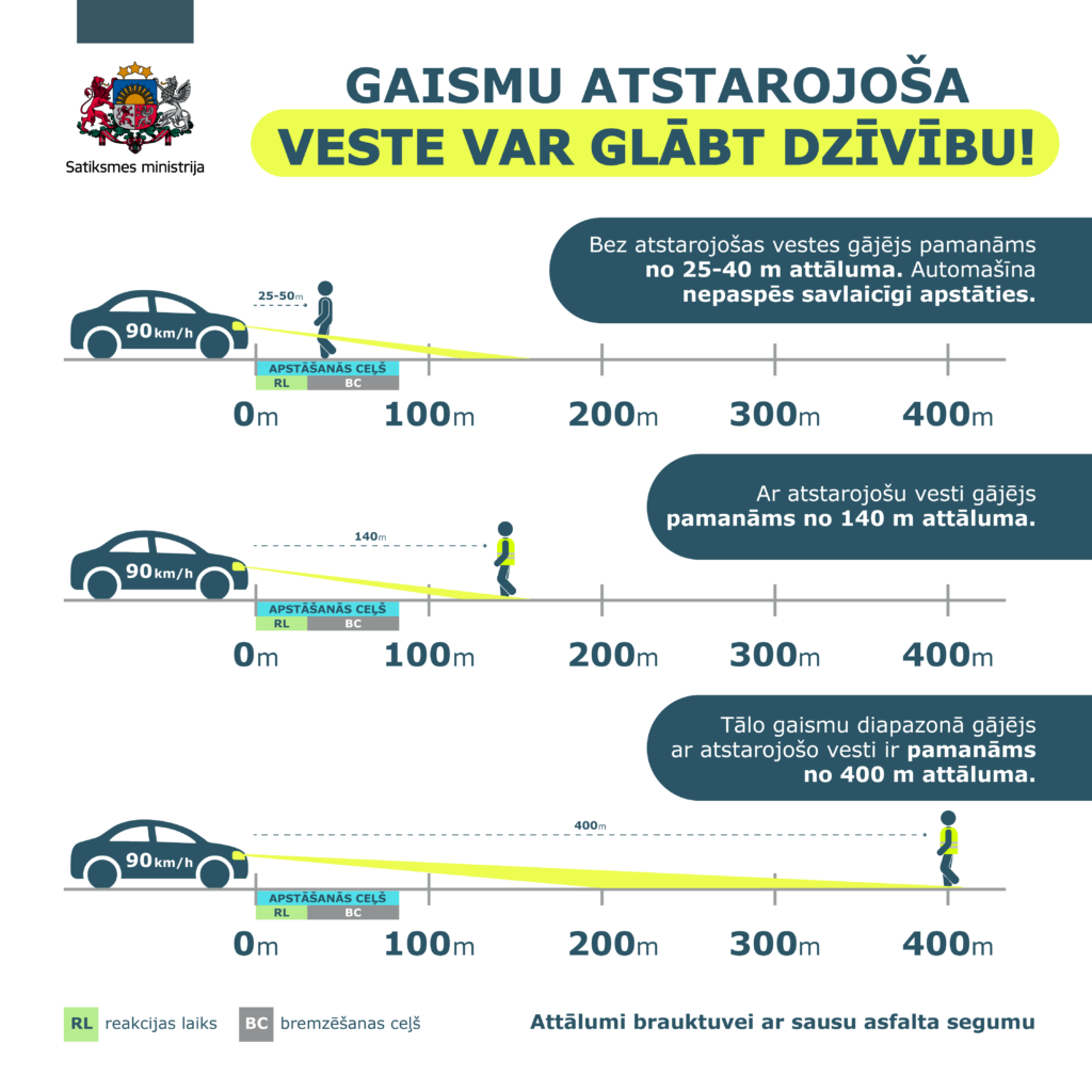 “Ar atstarojošu vesti cilvēks ir pamanāms, un autobraucējs var savlaicīgi nobremzēt, izvairoties no sadursmes. Uz ceļa ar asfalta segumu ārpus apdzīvotām vietām, kur var braukt ar 90 km/h, cilvēku ar gaismu atstarojošo vesti tuvo gaismu diapazonā var pamanīt 140 metru attālumā. Savukārt, ja cilvēks uz brauktuves ir bez atstarojoša elementa, to var pamanīt aptuveni 25-40 metru attālumā, kas nav pietiekami, lai apturētu transportlīdzekli, jo bremzēšanas ceļš ir aptuveni 100 metri. Tāpat jāņem vērā, ka lietainā laikā redzamība ir sliktāka un bremzēšanas ceļš garāks,” uzsver Vectirāns. “Tāpat, pasliktinoties redzamībai, jābūt vēl uzmanīgākiem, šķērsojot brauktuves. Tas jādara tam paredzētajās vietās, vispirms pārliecinoties, ka netuvojas automašīnas un ir droši. Ja būsim atbildīgi un domāsim par savu drošību, pasargāsim sevi un arī citus.”