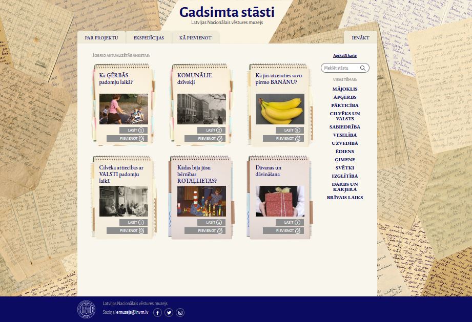 Latvijas Nacionālā vēstures muzeja digitālā krātuve eMuzejs papildināta ar jaunu projektu Gadsimta stāsti. Iesaistot visplašāko cilvēku loku, tajā iecerēts muzejnieku un sabiedrības pārstāvju kopīgiem spēkiem dokumentēt un saglabāt liecības par 20. gadsimta un arī 21. gadsimta sākuma ikdienas dzīvi Latvijā – to dzīvesveidu, kuru vēl atceras pašlaik dzīvojošās paaudzes, bet kas pamazām sāk izzust no mūsu sociālās atmiņas.