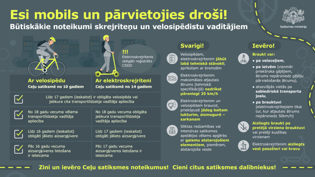 “Esmu gandarīts, ka šis valdības lēmums, akceptējot izmaiņas Ceļu satiksmes noteikumos, veicinās ikviena, īpaši mazāk aizsargāto ceļu satiksmes dalībnieku drošību. Ja katrs atbildīgi ievēros noteikumus, ir iespēja būtiski samazināt ar elektroskrejriteņiem un velosipēdiem saistītu nelaimes gadījumu skaitu, tādējādi sekmējot ilgtspējīgas mikromobilitātes popularitāti un attīstību mūsu valstī,” uzsver satiksmes ministrs Kaspars Briškens.