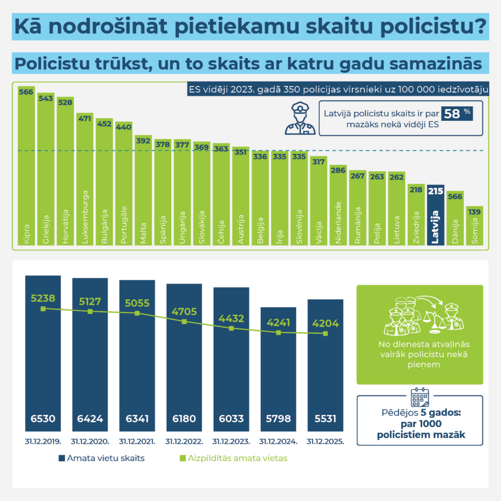 Valsts kontroles revīzijā secināts, ka galvenais iemesls, kāpēc Valsts policijā trūkst policistu, vairs nav atalgojums, bet gan cilvēkresursu pārvaldība un uzdevumu prioritizēšana. Pēdējos piecos gados policistu skaits ir samazinājies par vairāk nekā 1000. Šobrīd vakantas ir aptuveni ceturtā daļa amata vietu, kuras ilgstoši nevar aizpildīt. Latvijā policistu skaits uz iedzīvotāju skaitu ir par 58 % mazāks nekā vidēji Eiropas Savienībā.