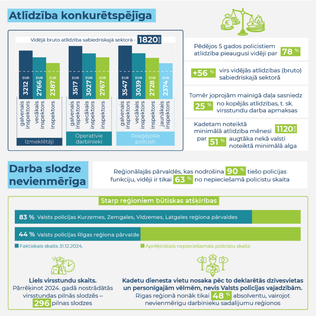 Tomēr atlīdzības sistēmai būtu jābūt taisnīgākai, ņemot vērā darba apjomu un noslodzi. Rīgas reģiona pārvaldes amatpersonu noslodze ir būtiski lielāka, bet atlīdzība ir tikai nedaudz augstāka nekā citās reģiona pārvaldēs. Tas negatīvi ietekmē iespējas Rīgas reģiona pārvaldē piesaistīt jaunus policistus un noturēt tos dienestā. Jāatzīmē, ka joprojām lielu daļu no kopējās atlīdzības veido mainīgā daļa, tajā skaitā samaksa par virsstundām.