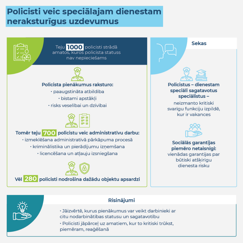Revīzijā konstatēts, ka Valsts policijā liela daļa policistu ir nodarbināti amatos, kuru pienākumi pēc būtības neprasa policista statusu, paaugstinātu risku vai specifisku fizisko sagatavotību. Šo policistu darbs pārsvarā ir saistīts ar rutīnas un administratīviem pienākumiem. Piemēram, administratīvo pārkāpumu izmeklēšana, kriminālistika, licencēšana vai metodiskais darbs, kuros strādā vairāk nekā 700 policistu. Tas nozīmē, ka dienestam speciāli sagatavoti policisti nedarbojas jomās, kur viņu klātbūtne ir kritiski nepieciešama, piemēram, reaģēšanā.