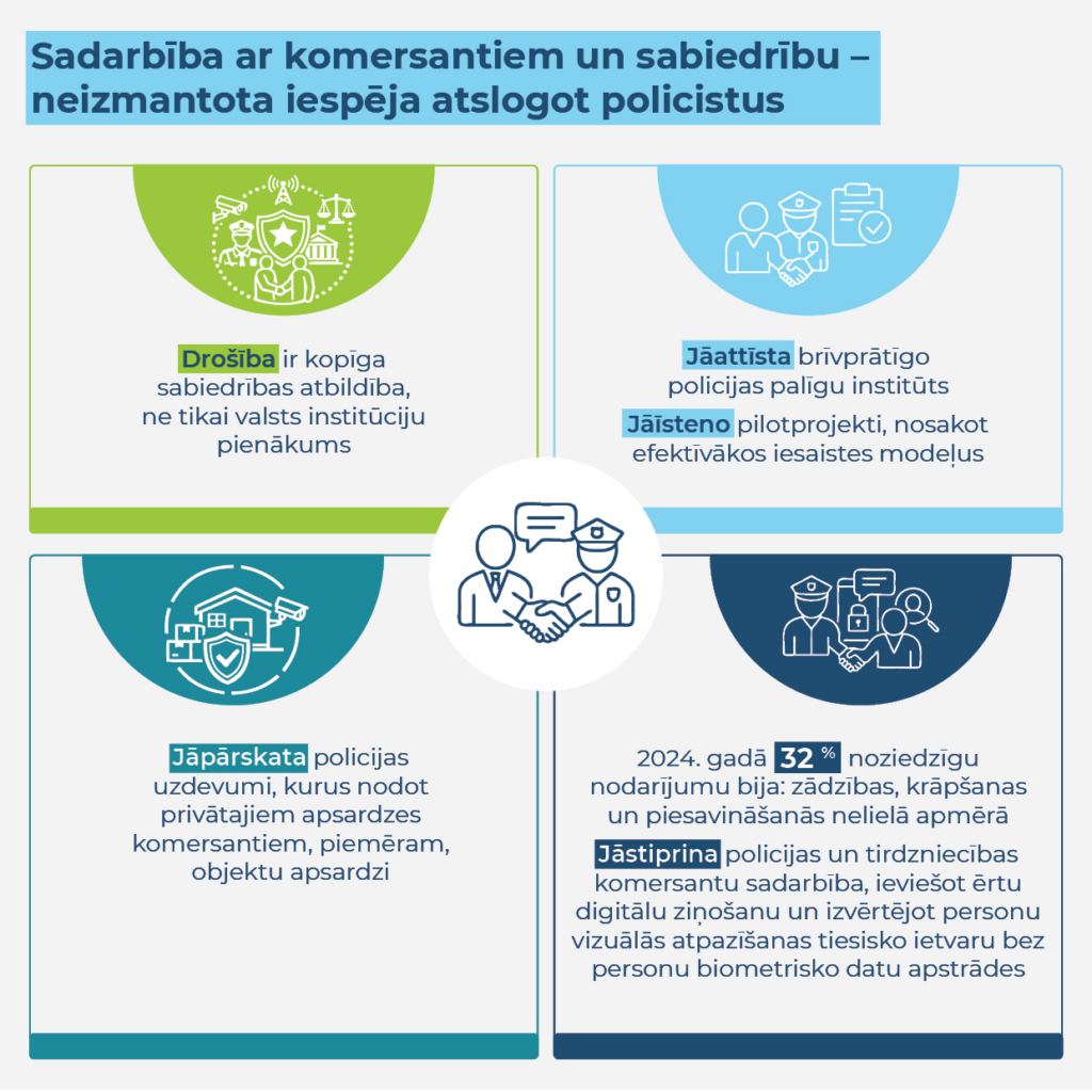 Īpaša uzmanība jāpievērš sadarbībai ar tirdzniecības komersantiem. 2024. gadā zādzības, krāpšanas un piesavināšanās nelielā apmērā bija 32 % no visiem reģistrētajiem noziegumiem. Efektīvāku prevenciju un izmeklēšanu kavē tas, ka nav vienota sadarbības formāta un digitāla ziņošanas risinājuma, kā arī neskaidrais tiesiskais ietvars personu vizuālai atpazīšanai bez biometrisko datu apstrādes.