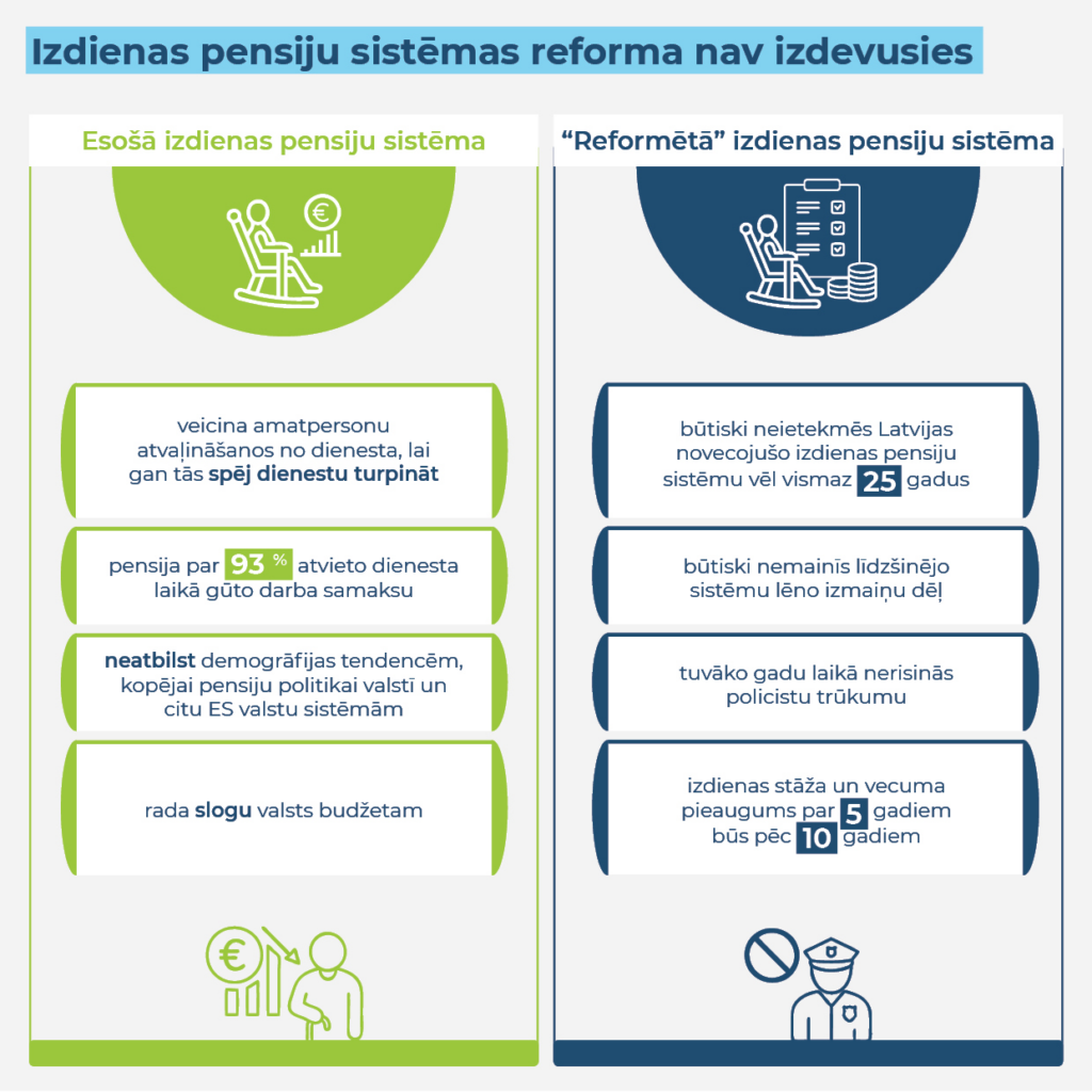 Plānotais izdienas stāža un vecuma pieaugums par pieciem gadiem notiks pakāpeniski desmit gadu laikā, un tas nerisinās policistu trūkumu tuvākajā nākotnē. Turklāt reforma var neskart pat būtisku daļu amatpersonu, kas arī turpmāk varēs doties izdienas pensijā salīdzinoši agrā vecumā. Latvijas izdienas pensiju sistēma turpinās būtiski atšķirties no citu Eiropas Savienības dalībvalstu sistēmām, kurās ir atšķirīgi pensionēšanās noteikumi vai pat ir atceltas izdienas pensijas. Lai nodrošinātu taisnīgu, samērīgu un valsts interesēm atbilstošu izdienas pensiju sistēmu, tā ir jāturpina reformēt.