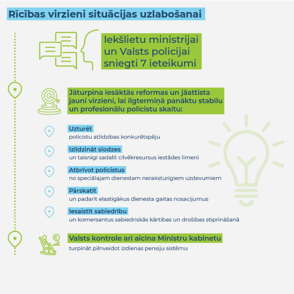 Lai risinātu policistu trūkumu un uzlabotu Valsts policijas darba efektivitāti, Valsts kontrole Iekšlietu ministrijai un Valsts policijai sniegusi septiņus ieteikumus. To ieviešana izlīdzinās policistu noslodzi, ļaus efektīvāk izmantot policistus kritiski svarīgu policijas funkciju izpildei, veicinās pieredzējušu policistu noturēšanu dienestā. Tāpat policisti tiks atslogoti no to klātbūtnes mazāk nozīmīgu situāciju risināšanā, plašāk iesaistot sabiedrību un komersantus.