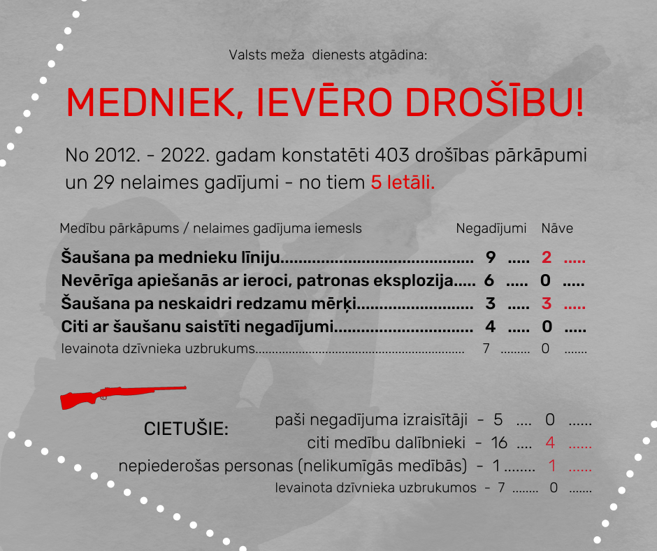 Laika posmā no 2012. līdz 2022. gadam konstatēti 403 medību drošības prasību pārkāpumi un notikuši 29 nelaimes gadījumi, no kuriem pieci beigušies letāli. Divi nāvējoši gadījumi notikuši nelegālās medībās, un vienā no tiem bojā gājusi nepiederoša persona. Šis ir vienīgais gadījums desmit gadu laikā, kad cietušais nav bijis medību dalībnieks. Piecos gadījumos cietuši paši nelaimes gadījumu izraisītāji, 16 gadījumos – citi medību dalībnieki. Septiņos gadījumos medību dalībnieki cietuši ievainotu dzīvnieku uzbrukumos.
