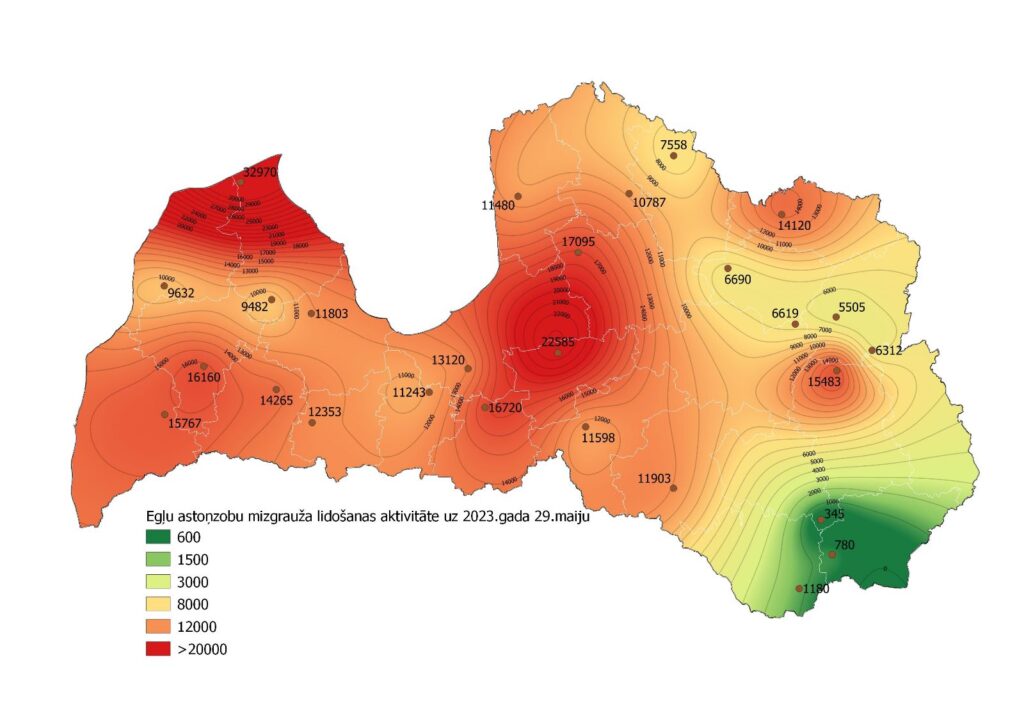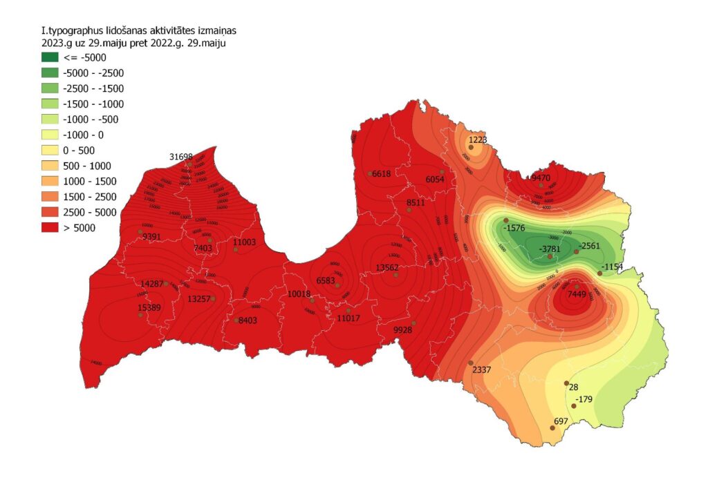 Valsts meža dienests šobrīd ir izsniedzis atļaujas svaigi invadētu egļu nociršanai 75 ha platībā, pamatā Valmiera un Cēsu novados – 26 ha, Siguldas un Ogres novados – 17 ha, Dienvidkurzemes novadā -11 ha.