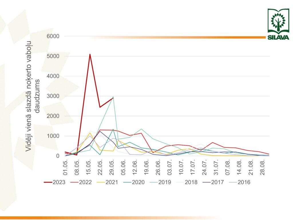 “LVMI “Silava” monitorē situāciju Latvijā saistībā ar mizgrauža lidošanas aktivitāti, un no iegūtajiem datiem ir redzams, ka aktīva izlidošana šogad ir sākusies 20. aprīlī. Apkopotie dati ir satraucoši – slazdos noķerto vaboļu skaits, salīdzinot ar 2022. gadu, ir divas reizes lielāks, bet 15. maijā tas bija jau 10 reizes lielāks, nekā iepriekšējā gadā,” situācijas nozīmīgumu skaidro Valsts meža dienesta Meža resursu pārvaldības departamenta direktore Solvita Mūrniece.