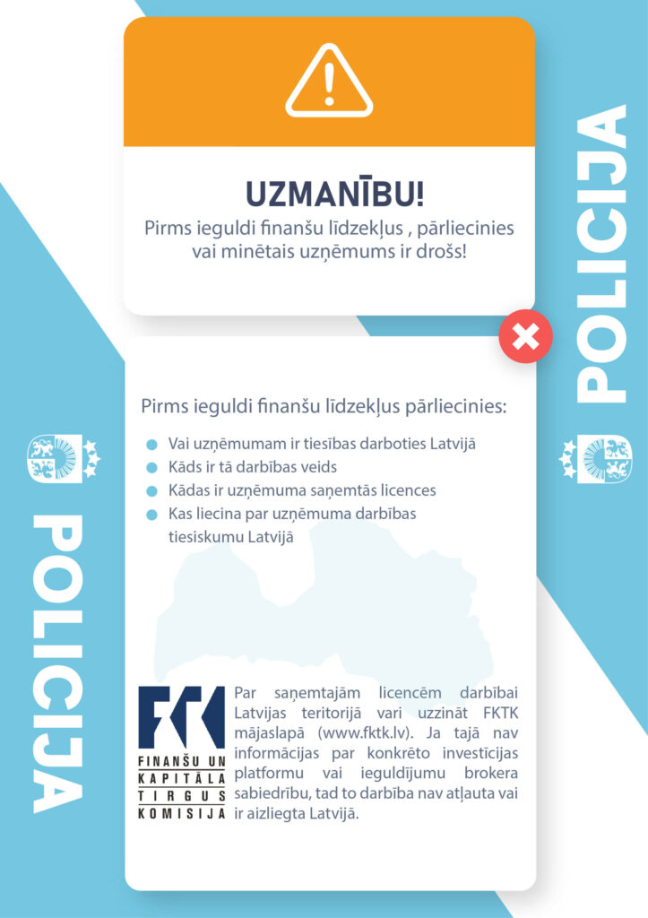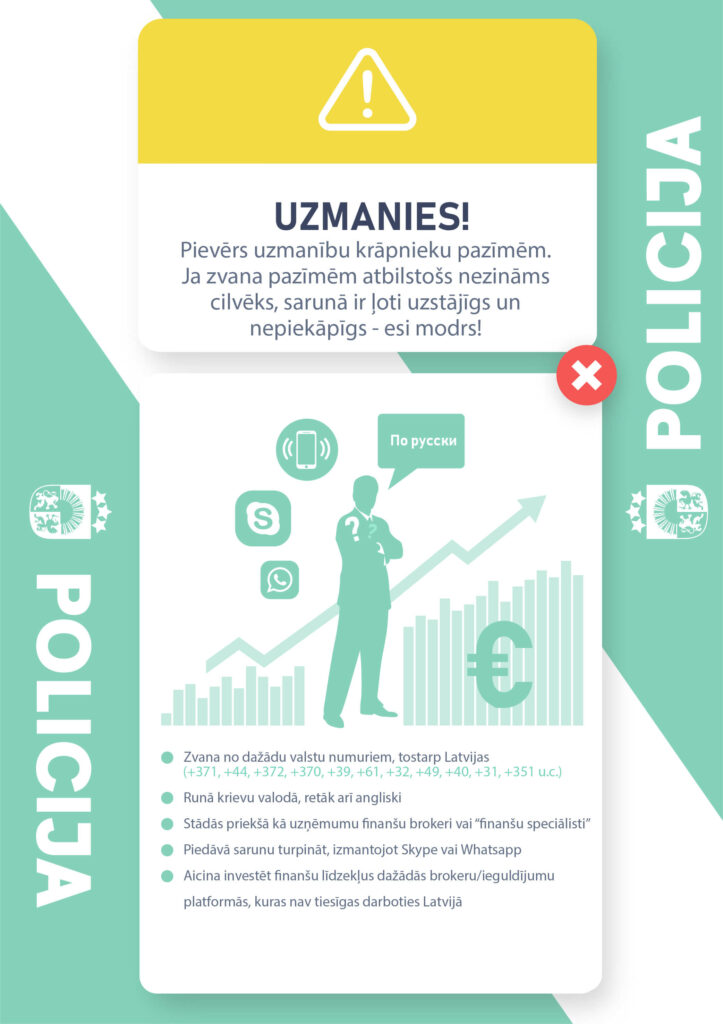 “Policija atkārtoti aicina iedzīvotājus būt piesardzīgiem, saņemot telefona zvanus no nezināmām personām, kuras runā tikai un vienīgi krievu valodā, sauc sevi par dažādu uzņēmumu finanšu brokeriem vai arī cita veida “finanšu speciālistiem”. Tāpat nevajadzētu būt pārlieku uzticīgiem, komunicējot ar nepazīstamiem cilvēkiem vai iepazīstoties sociālos tīklos ar virtuālajiem lietotājiem. Nedrīkst nevienam izpaust savus personas vai elektronisko maksāšanas līdzekļu datus, tā jūs sevi varat pasargāt no kļūšanas par krāpniecības upuriem,” uzsver Z.Vaskāne.