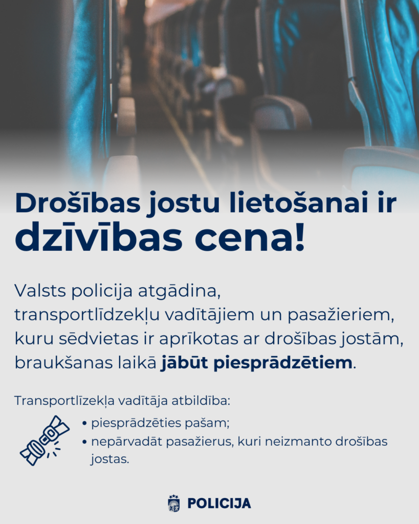 Valsts policija ikdienā novērojusi, ka situācija ar drošības jostu izmantošanu vieglajos transportlīdzekļos ar gadiem ir krietni uzlabojusies, bet šī tendence nav attiecināma uz mikroautobusiem un autobusiem. Negadījuma brīdī sekas šādam lēmumam nepiesprādzēties var būt smagas gan pašam, gan apkārtējiem pasažieriem. Diemžēl šādos negadījumos cieš arī bērni, tādēļ Valsts policija, Neatliekamās medicīniskās palīdzības dienests un Bērnu klīniskā universitātes slimnīca atgādina, ka transportlīdzekļu vadītājiem un pasažieriem, kuru sēdvietas ir aprīkotas ar drošības jostām, braukšanas laikā jābūt piesprādzētiem!