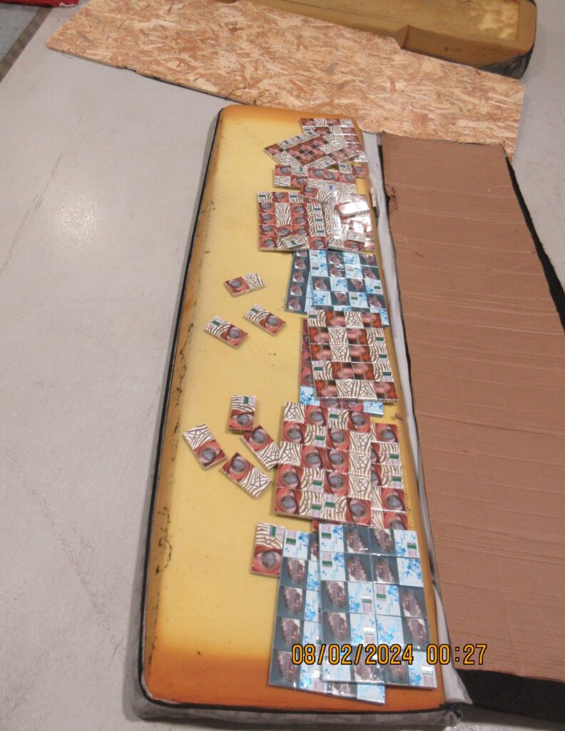 Savukārt pagājušajā nedēļā, 7. februārī, Terehovas muitas kontroles punkta amatpersonas, veicot no Krievijas iebraukušo transportlīdzekļu kontroli, atklāja nedeklarētas cigaretes kādā kravas automašīnā. Pārbaudot kabīnē esošos guļamplauktus, muitnieki konstatēja, ka abos matračos ir paslēptas cigaretes. Noņemot apakšējo guļamplauktu, arī zem tā atklājās ar cigaretēm pilna slēptuve. Kontroles rezultātā tika izņemtas 8400 cigaretes jeb 420 paciņas cigarešu “Premjer”, “NZ Gold”, “Queen Menthol” un “Lucky Strike”.